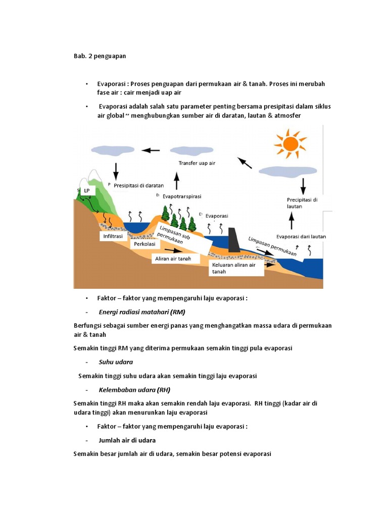 Definisi evaporasi menurut manan dan suhardianto (1999) adalah perubahan air menjadi uap air. Lakitan (1994) pengertian evaporasi menurut lakitan adalah suatu proses penguapan air yang berasal dari permukaan bentangan air atau dari bahan padat yang mengandung air. Laju evaporasi adalah laju neto antara evaporasi dan kondensasi yang sebanding dengan perbedaan tekanan uap air dipermukaan air dan tekanan uap air di udara di atasnya. Arti dan pentingnya bagi teknik sipil evaporasi (penguapan) adalah proses perubahan zat cair menjadi gas (uap air) yang bergerak ke atmosfir. Hal ini terjadi karena susu evaporasi berasal dari susu cair segar yang mengalami proses pemanasan dengan suhu tinggi. Tujuan dari evaporasi itu sendiri yaitu untuk memekatkan larutan yang terdiri dari zat terlarut yang tak mudah menguap dan pelarut yang mudah menguap. Tahap kedua setelah pengukuran eto adalah pencarian kc. Tujuan dari evaporasi itu sendiri yaitu untuk memekatkan larutan yang terdiri dari zat terlarut yang tak mudah menguap dan pelarut yang mudah menguap. Susunan dari kimia air (h2o) yakni dengan cara alami di atmosfer yang kemudian terbagi menjadi 3 tingkatan diantaranya gas, cair dan juga padat. Evaporasi adalah proses perubahan benda cair menjadi gas. Hal tersebut selain caranya yang praktis, dampak untuk kesehatan juga tidak ada sehingga. Evaporasi adalah proses dimana air diubah menjadi uap air dan selanjutnya uap air tersebut dipindahkan dari permukaan lahan melalui proses penguapan ke atmosfer. Ketika curah hujan terjadi (embun, hujan, salju), air kembali ke cekungan dan siklusnya selesai.
